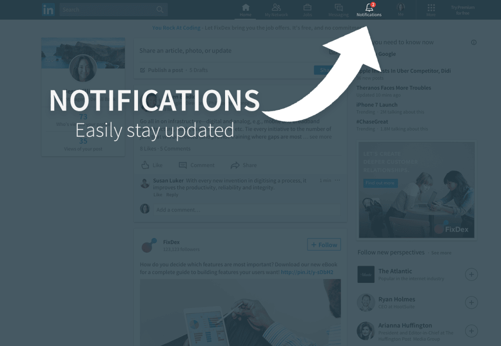 Elles se situent en haut à droite dans la barre du menu et récapitulent toutes les actualités qui se sont déroulées pendant que vous étiez absent, elles sont liées à vos relations professionnelles et aux personnes que vous suivez. Vous pouvez les consulter simplement en cliquant dessus.